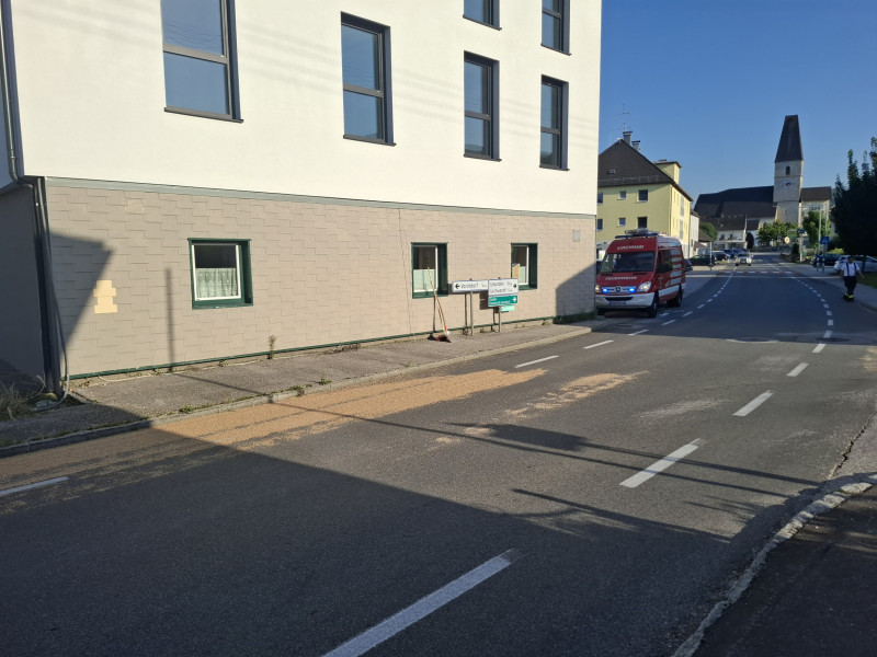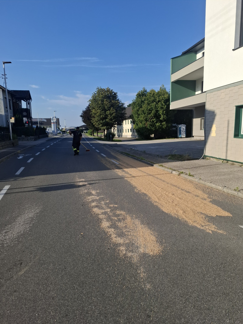 Ein Landwirt hatte beim Transport Getreide verloren, das sich auf der Fahrbahn verteilt hatte und so eine Gefahr für den Verkehr darstellte.