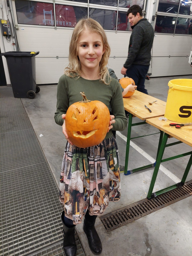 Am Ende leuchteten die Kürbisse stolz vor dem Feuerwehrhaus und sorgten für echte Halloween-Stimmung!