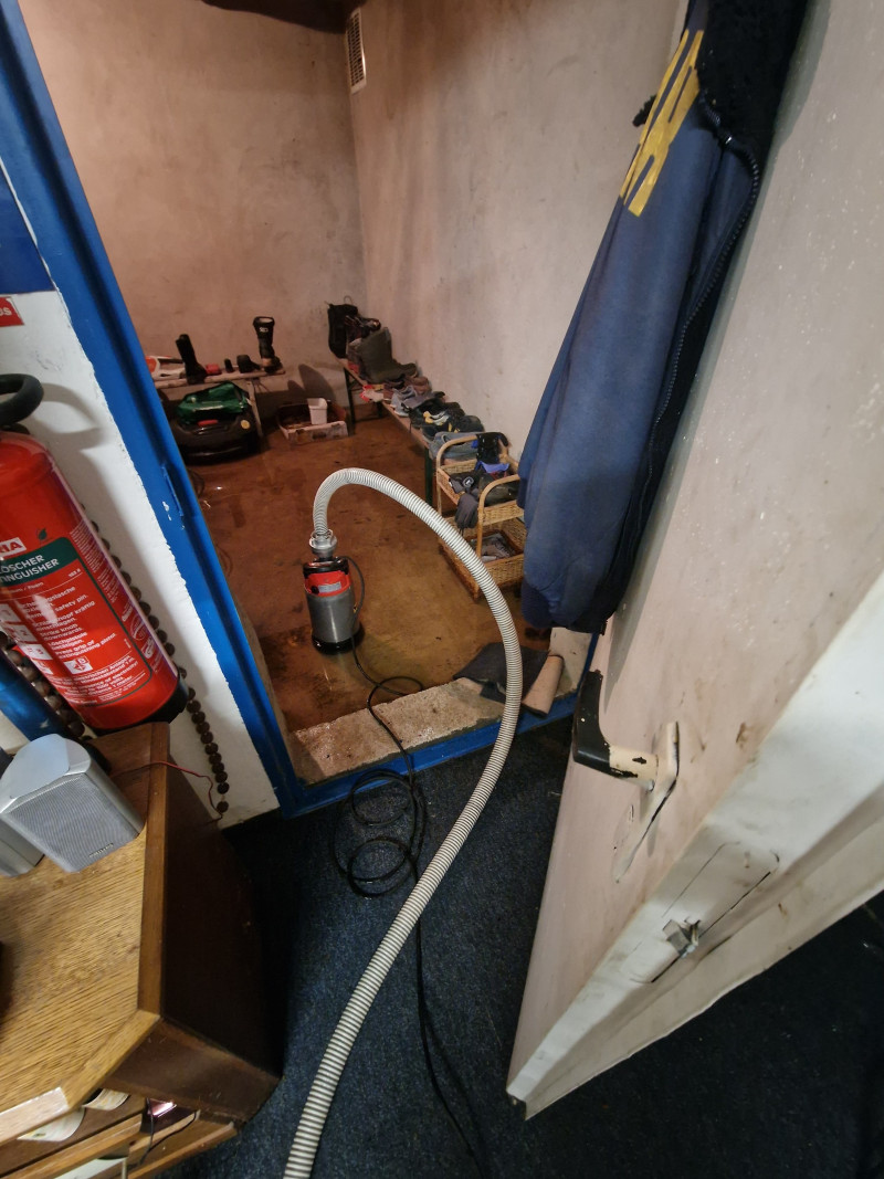 In einem Keller eines Einfamilienhauses kam es zu einem erheblichen Wasserschaden. Der Keller stand unter Wasser, welches mithilfe unserer Pumpen aus dem Gebäude abgepumpt wurde.